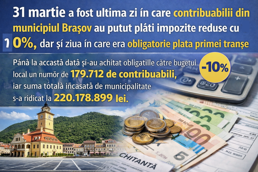 3. 31 martie a fost ultima zi în care contribuabilii din municipiul Braşov au putut plăti impozite reduse cu 10%, dar şi ziua în care era obligatorie plata primei tranşe