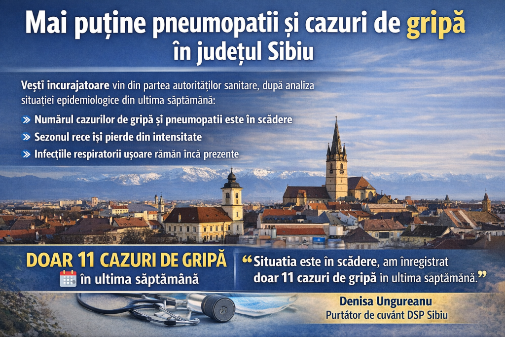Vești încurajatoare vin din partea autorităților sanitare, după analiza situației epidemiologice din județul Sibiu în ultima săptămână; numărul cazurilor de gripă și pneumopatii este în scădere, semn că sezonul rece își pierde din intensitate, în timp ce infecțiile respiratorii ușoare rămân încă prezente; Denisa Ungureanu, purtătorul de cuvânt al Direcției de Sănătate Publică Sibiu, spune că în ultima săptămână au fost raportate doar 11 cazuri de gripă.