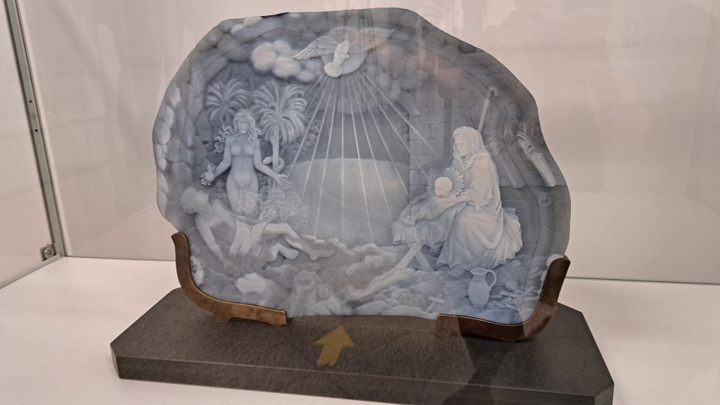 Lucrarea monumentală „Bătrânul Adam și Omul Nou” este realizată din agat importat din Brazilia, cântărește 4,68 kilograme și a fost sculptată în 1.070 de ore de Andreas Roth împreună cu tatăl său, înainte de moartea acestuia.