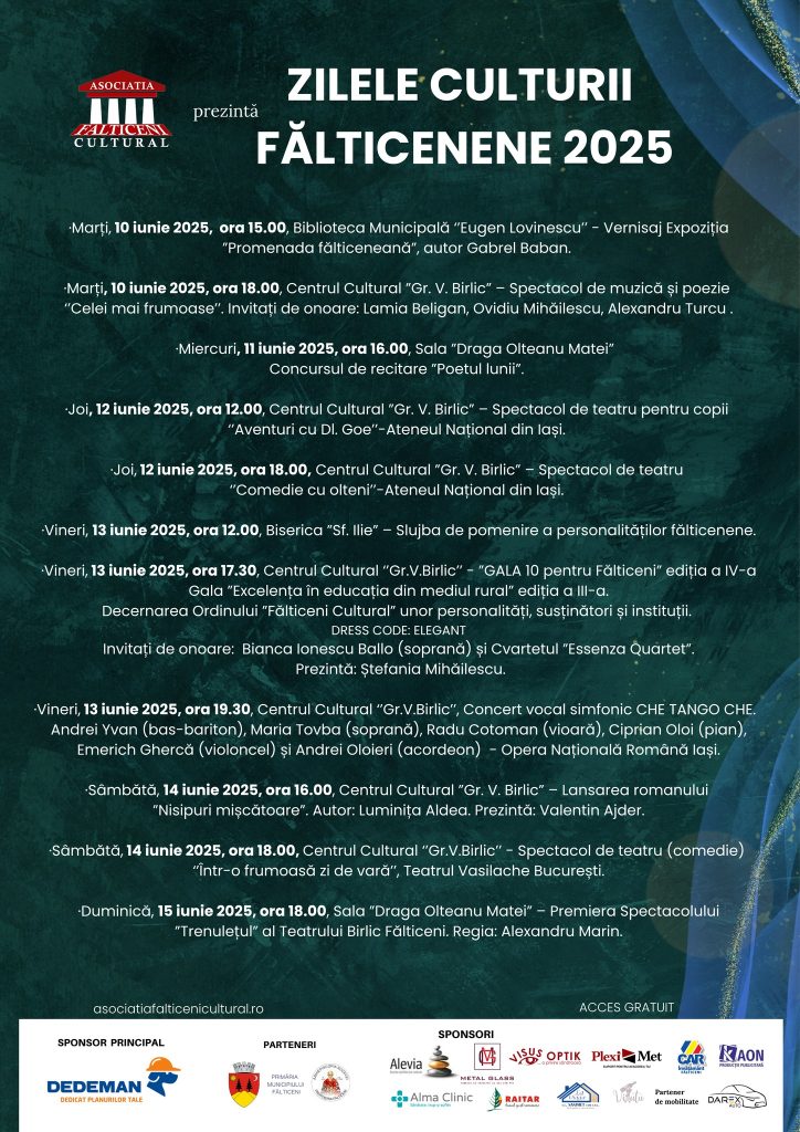 12. În perioada 10–15 iunie 2025, municipiul Fălticeni devine epicentrul culturii regionale, printr-o nouă ediție a „Zilelor Culturii Fălticenene”, eveniment organizat de Asociația „Fălticeni Cultural”