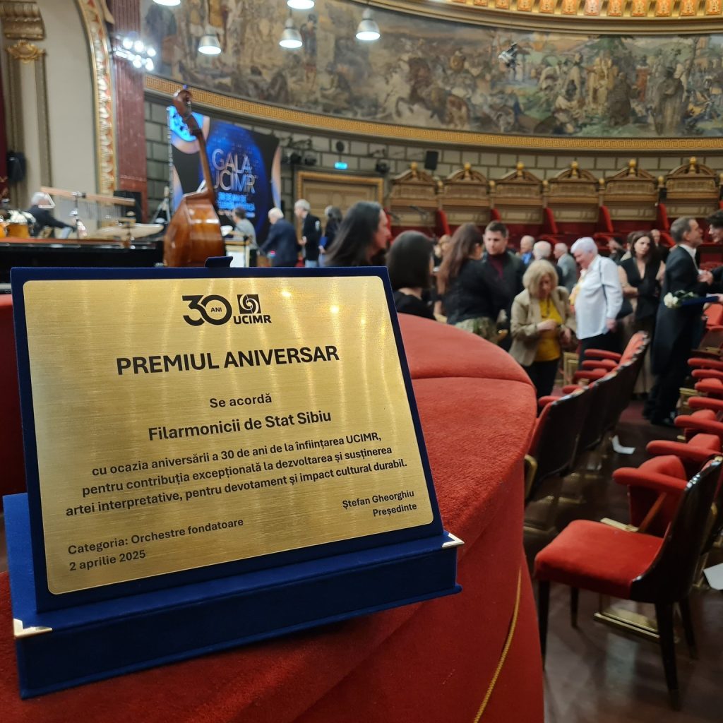 3. Uniunea de Creație Interpretativă a Muzicienilor din România (UCIMR) a decernat Filarmonicii de Stat Sibiu un premiu aniversar, care celebrează realizările artistice pentru întreaga activitate a instituției