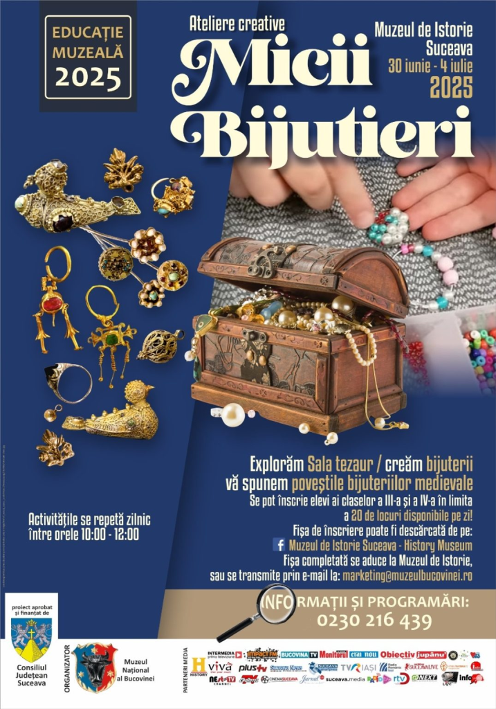 Muzeul Național al Bucovinei organizează, între 30 iunie și 4 iulie 2025, atelierul de educație muzeală „Micii bijutieri”, destinat elevilor din clasele a III-a și a IV-a.