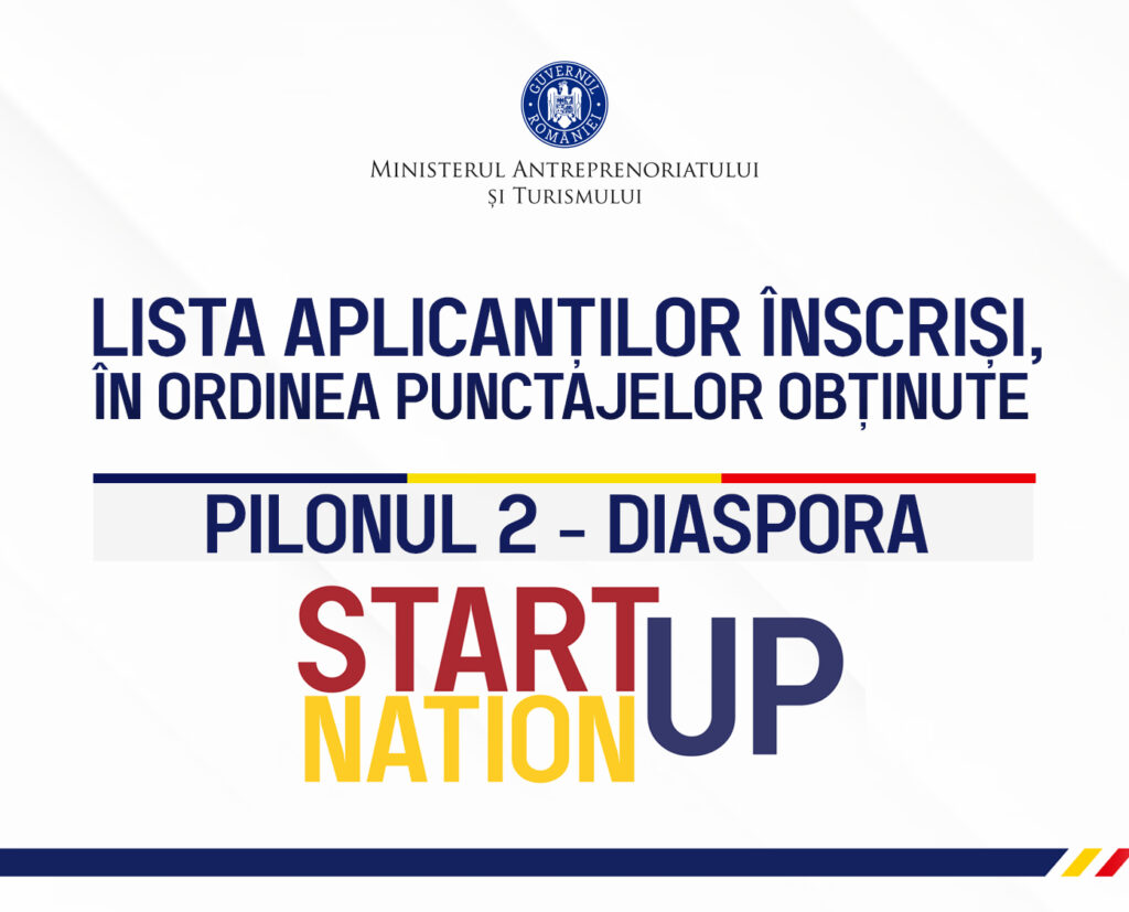 Ministerul Antreprenoriatului şi Turismului (MAT) a publicat lista aplicanţilor înscrişi în cadrul Pilonului II Start-Up Nation Diaspora, în ordinea descrescătoare a punctajelor obţinute la finanţare.