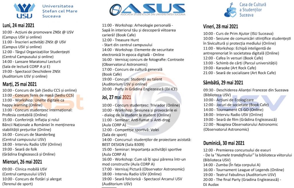 Cea de a XI-a ediție a Festivalului „Zile și nopți studențești” începe luni, 24 mai, la Universitatea „Ștefan cel Mare” Suceava. Mai mult de 50 de evenimente se vor desfășura on-site şi on-line până pe 30 mai, iar ître acestea se numără care concursuri individuale și pe echipe, evenimente educaționale extra-curriculare, spectacole de muzică, teatru și film. La acestea se adaugă jocuri și activități sportive, conferințe și ateliere de lucru, acțiuni civice și seri sociale. Intrarea la aceste evenimente este liberă, în limita locurilor disponibile şi a condiţiilor impuse de măsurile de siguranţă sanitară. Informaţii suplimentare se găsesc pe pagina de Facebook a evenimentului.