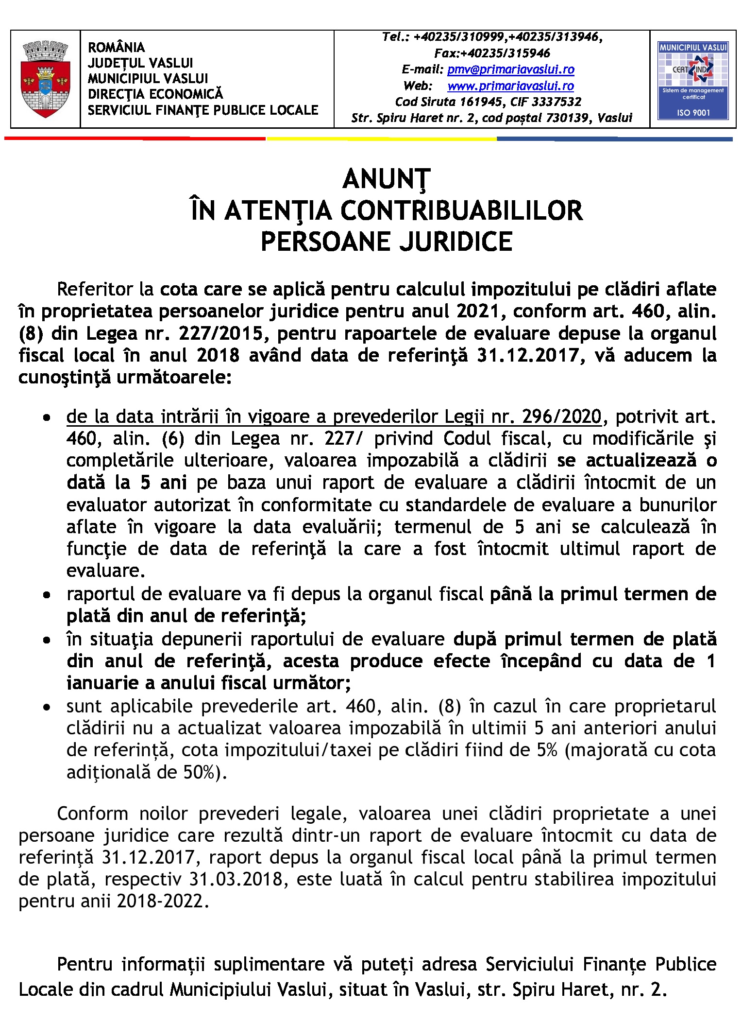 Anunț important pe site-ul Primăriei Vaslui referitor la contribuabilii persoane juridice: Referitor la cota care se aplică pentru calculul impozitului pe clădiri aflate în proprietatea persoanelor juridice pentru anul 2021, conform art. 460, alin. (8) din Legea nr. 227/2015, pentru rapoartele de evaluare depuse la organul fiscal local în anul 2018 având data de referinţă […]