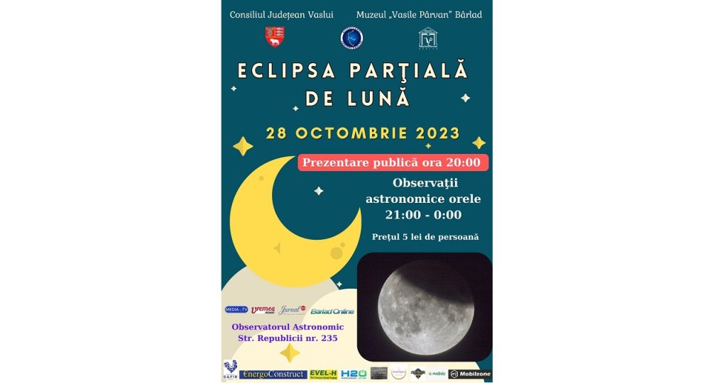 Eclipsa parţială de Lună din 28 octombrie 2023 – sâmbătă seara, pe 28 octombrie 2023 publicul este invitat să participe la Observatorul Astronomic din cadrul Muzeului „Vasile Pârvan” din Bârlad, la o prezentare publică şi observaţii astronomice cu prilejul eclipsei parţiale de Lună. Fenomenul astronomic va fi vizibil în intervalul orar 22:00 – 0:00. Cei […]