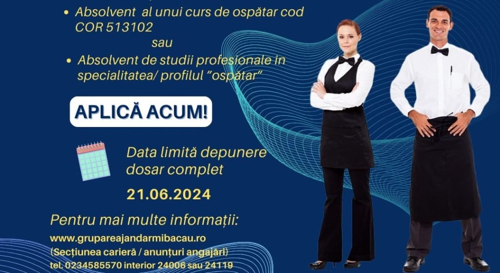 Gruparea de Jandarmi Mobilă „Alexandru cel Bun” Bacău anunță că a demarat procedurile pentru încadrarea prin concurs a unei funcții vacante de muncitor calificat IV-I (ospătar). Pentru participarea la acest concurs, candidatul trebuie să îndeplinească următoarele condiții generale și cerințe specifice: Condiții generale: a) are cetățenia română sau cetățenia unui alt stat membru al Uniunii […]