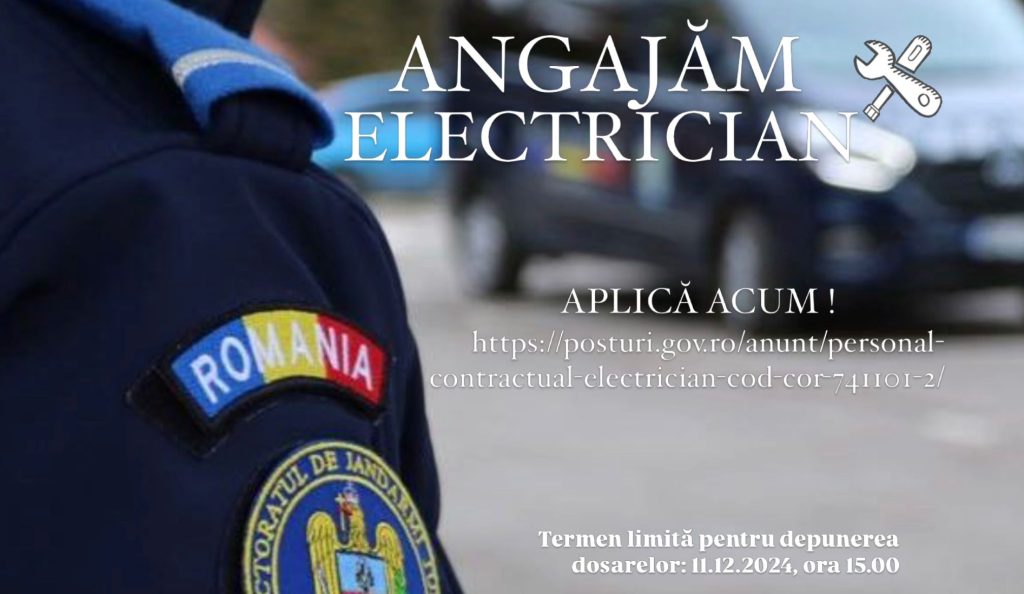 Inspectoratul de Jandarmi Județean Bacău a scos la concurs, prin ocupare din sursă externă, un post de personal contractual: electrician. Cererea de înscriere și documentele constitutive ale dosarului de recrutare se depun până la data de 11.12.2024, ora 15.00, în zilele lucrătoare, în intervalul orar 08.00-16.00, la serviciul Resurse Umane al Inspectoratului de Jandarmi Județean […]