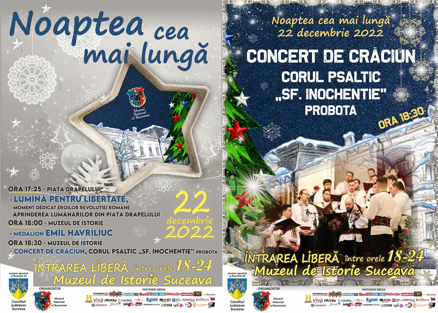 Muzeul Național al Bucovinei vă invită, ca în fiecare an, să sărbătorim împreună Solstițiul de iarnă, „Noaptea cea mai lungă”, la Muzeul de Istorie, pe 22 decembrie 2022, cu următorul program: Ora 17,25 – Lumină pentru libertate – Moment dedicat eroilor Revoluției Române (aprinderea lumânărilor din Piața Drapelului). Ora 18 – Medalion Emil Havriliuc, la […]
