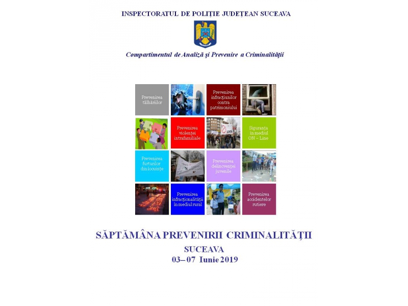 În perioada 03 – 07 iunie a.c. se derulează, la nivel naţional, prima etapă a evenimentului „Săptămâna Prevenirii Criminalităţii”, în cadrul căruia vor fi abordate paliere de interes instituţional: prevenirea delincvenței juvenile și victimizării minorilor, prevenirea infracţiunilor contra patrimoniului, violenţa intrafamilială, siguranţa rutieră şi siguranţa în mediul on-line. La nivelul judeţului Suceava, sub coordonarea […]