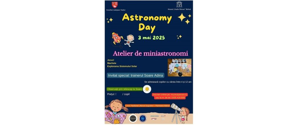 Muzeul „Vasile Pârvan” din Bârlad va organiza sâmbătă, 3 mai 2025, cu ocazia Zilei Internaționale a Astronomiei, ateliere interactive pentru copii cu vârste între 4 și 12 ani, denumite „Atelier de Miniastronomi”. Evenimentul va avea loc în curtea Pavilionului Muzeal „Marcel Guguianu” și va fi coordonat de muzeograful Dumitru Ciprian Vîntdevară. Atelierele se vor desfășura […]
