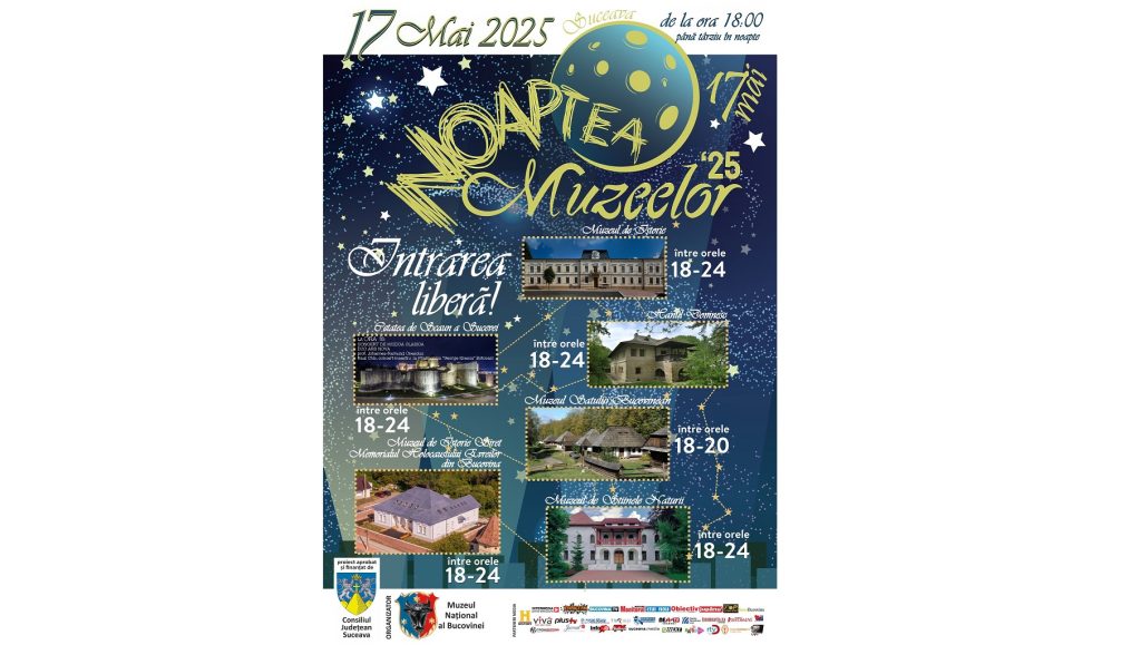Cu ocazia Nopții Muzeelor, sâmbătă, 17 mai 2025, Muzeul Național al Bucovinei deschide gratuit pentru public, în intervalul 18:00–24:00, șase obiective culturale: Muzeul de Istorie, Cetatea de Scaun, Muzeul Satului Bucovinean, Hanul Domnesc, Muzeul de Științele Naturii și Muzeul de Istorie Siret – Memorialul Holocaustului Evreilor din Bucovina. Accesul este permis până la ora 23:30, […]