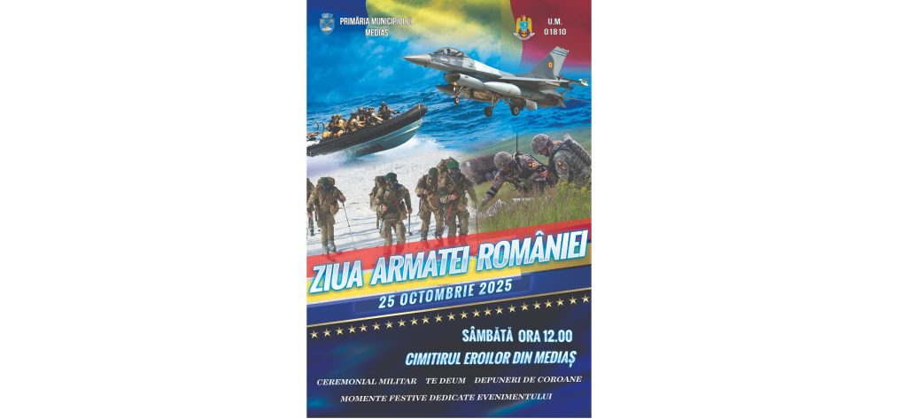 Sâmbătă, 25 octombrie 2025, Primăria Municipiului Mediaș, în colaborare cu UM 01810, va organiza un ceremonial dedicat Zilei Armatei Române. Evenimentul va avea loc la Cimitirul Eroilor, de la ora 12:00, în prezența autorităților locale, a reprezentanților militari, ai cultelor religioase și a cetățenilor. Manifestarea va cuprinde ceremonii militare și religioase, precum și depuneri de […]