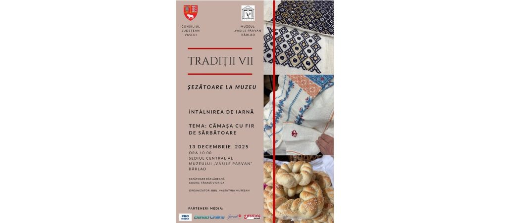 Muzeul, alături de grupul „șezătoare bârlădeană”, invită publicul sâmbătă, 13 decembrie 2025, la o întâlnire dedicată cămășii cu fir de sărbătoare, un meșteșug prețios al patrimoniului textil românesc. Participanții vor coase împreună cămăși tradiționale, vor afla povești despre obiceiurile de iarnă și despre simbolurile colacilor împletiți, într-o atmosferă care recreează spiritul șezătorilor de altădată. Activitatea […]
