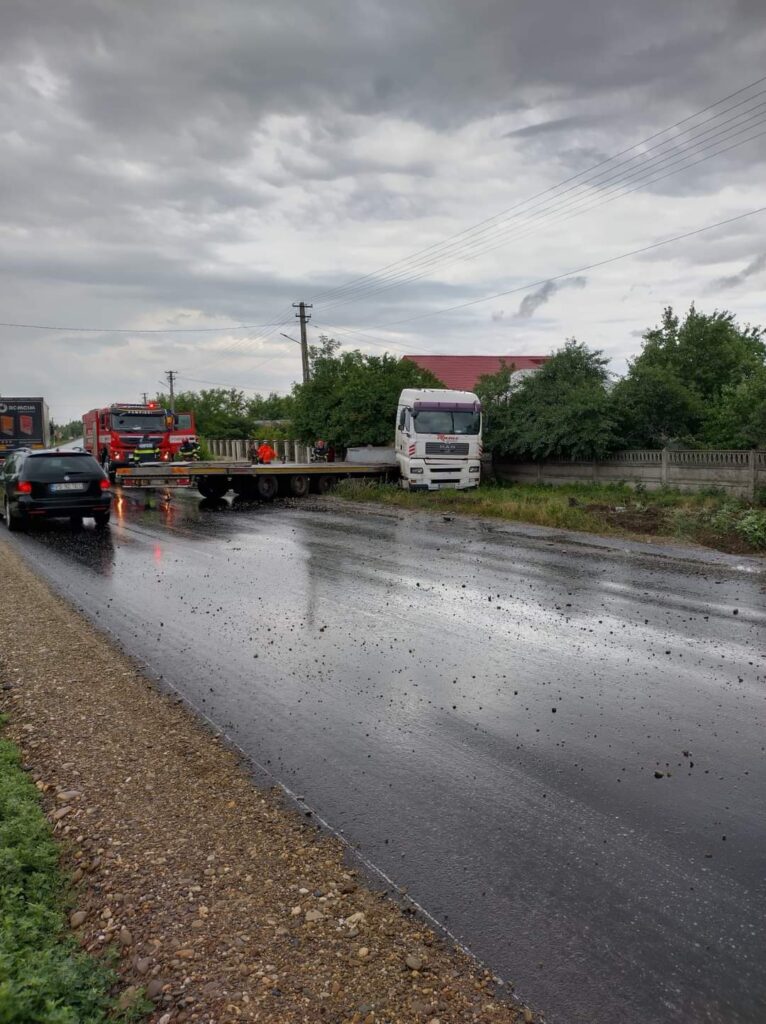 Update: La sosirea echipajului de intervenție a fost găsit un TIR care derapase și se răsturnase de-a lungul șoselei. Din rezervorul autovehiculului se scurgea combustibil.