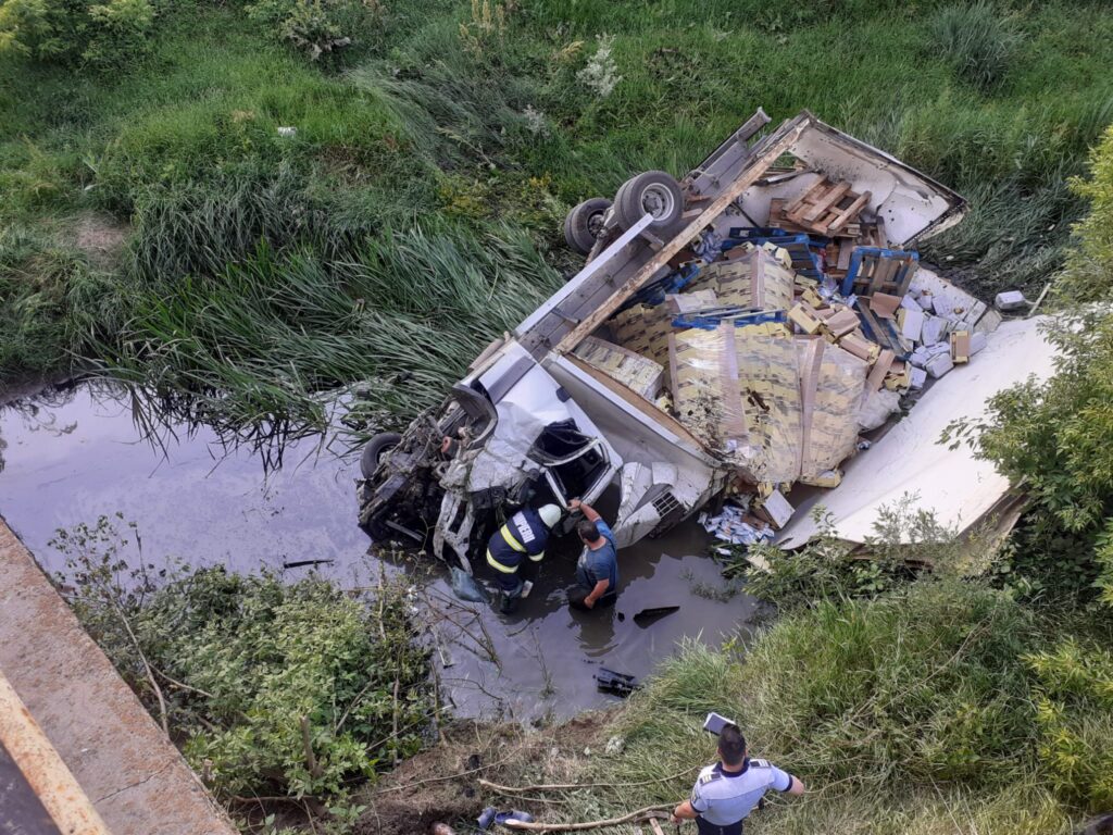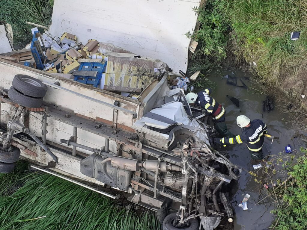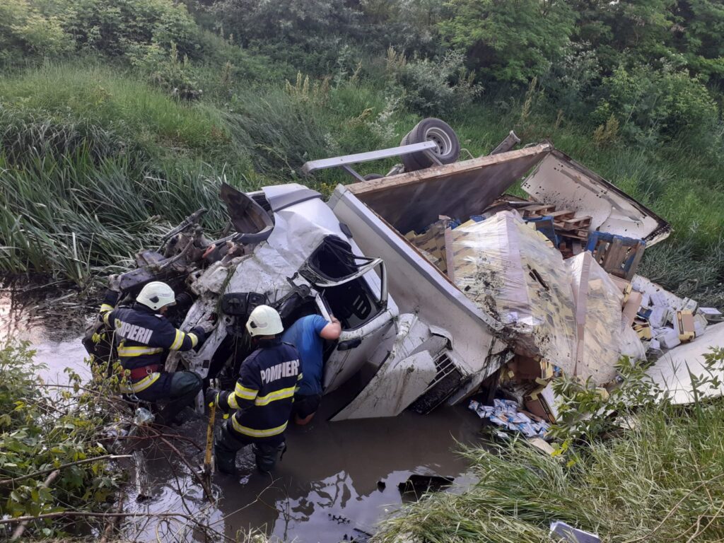 Un camion s-a răsturnat în afara carosabilului rezultând două victime (Foto-Video)