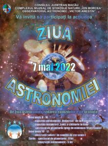 Cu această ocazie, publicul este invitat la Observatorul Astronomic „Victor Anestin” din Bacău, sâmbătă, 7 mai 2022, între orele 08:00 – 16:00 pentru a vizita expoziția permanentă „Universul – De la Pământ la stele” și expoziția temporară „Luna, o călătorie în timp”, pentru a viziona un spectacol de planetariu, iar în condițiile în care cerul va fi senin pentru a participa între orele 10:00 – 12:00 la observații solare.