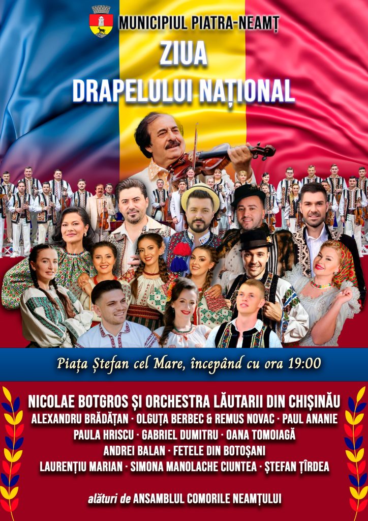Ziua Drapelului Național este marcată la Piatra-Neamț printr-un eveniment de excepție organizat în Piața Ștefan cel Mare. Începând cu ora 19:00, joi, 26 iunie 2025, publicul a fost invitat la un spectacol de muzică populară ce a celebrat valorile și identitatea românească. Pe scenă vor urca Nicolae Botgros și Orchestra „Lăutarii” din Chișinău, alături de numeroși interpreți îndrăgiți și Ansamblul Folcloric „Comorile Neamțului”, oferind un program artistic vibrant.